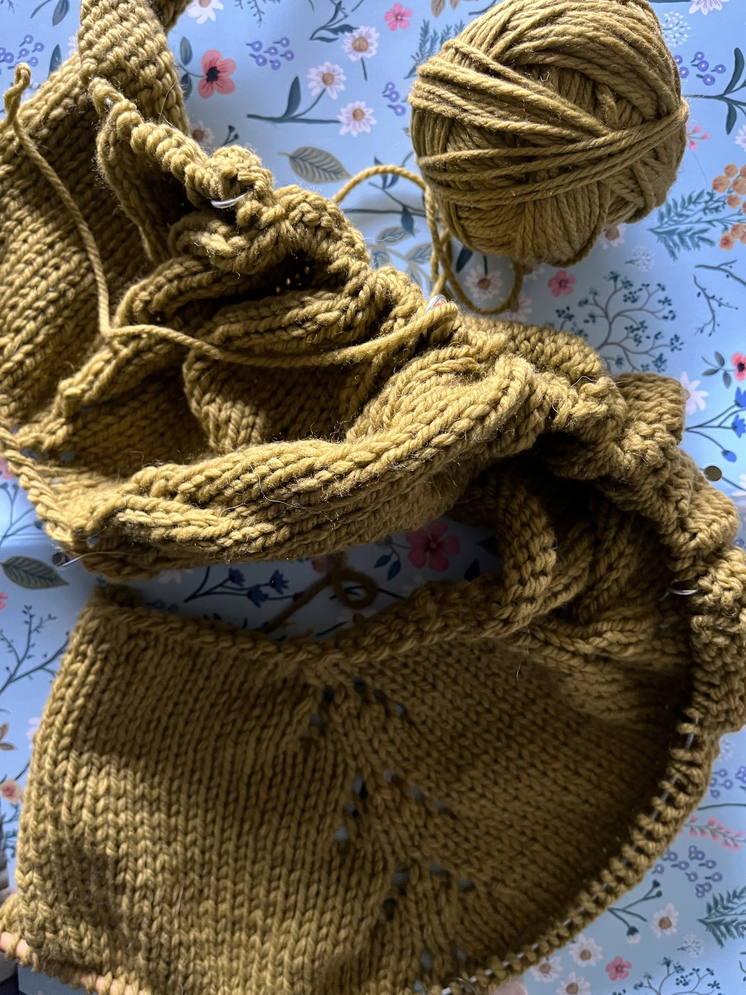 Before I knew it I had cast off the bottom hem and was on to the sleeves. Two things were instrumental in the joy of knitting the sleeves, rather than the dreaded sleeve island monotony so many knitters struggle with… And those two things were treats to listen to!