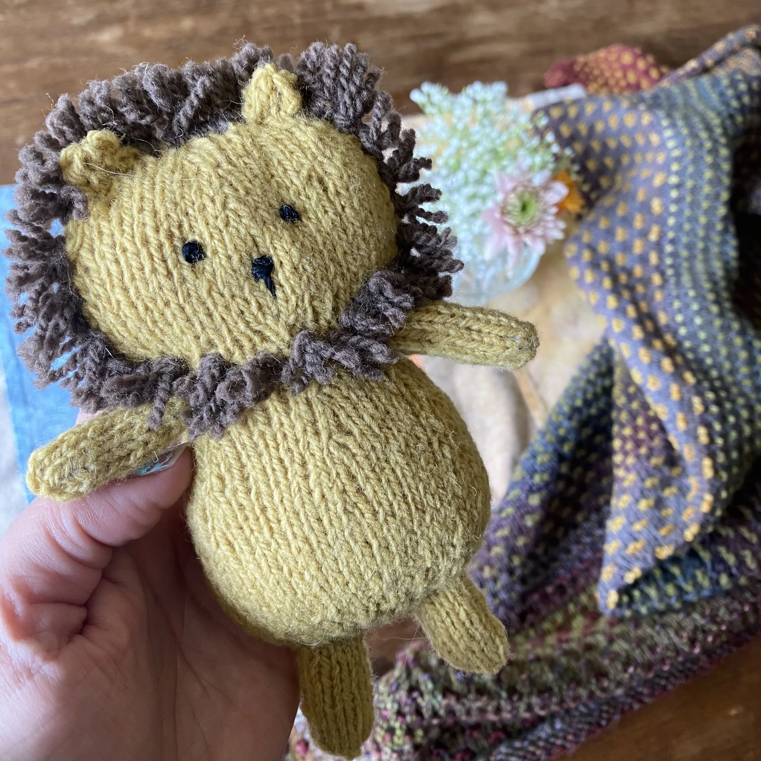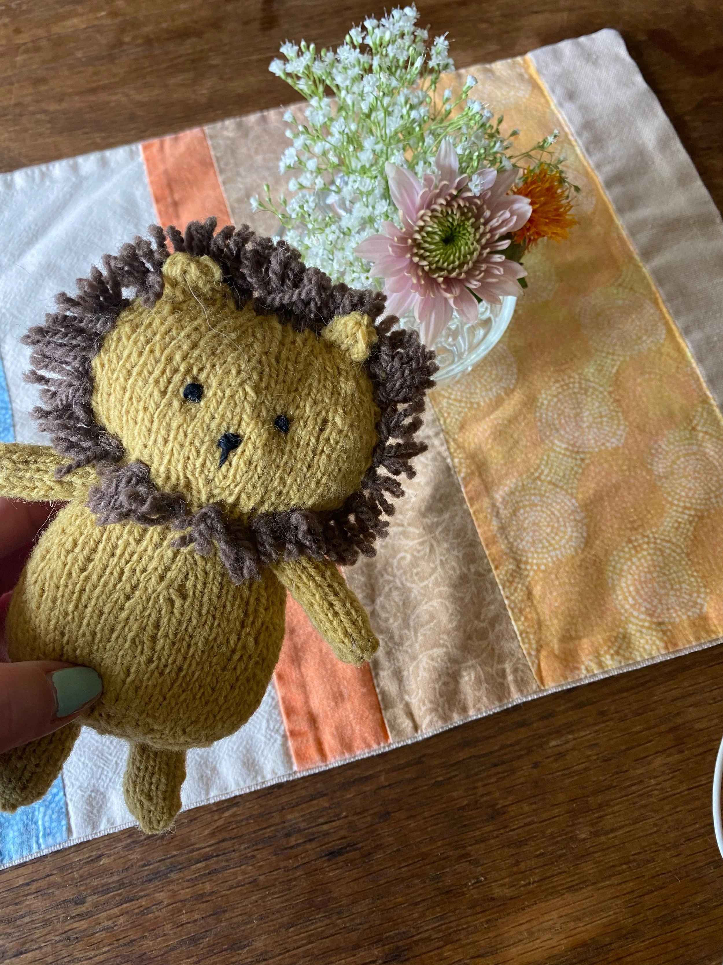 Leo had a clever construction, as many of her patterns share. He was knit from his bottom to his head, with arms, legs, tail and ears knit onto him by way of picking up stitches from the body. Once complete there is little finishing work, zero applying appendages, just a meditative application of his mane that I smiled my way through.