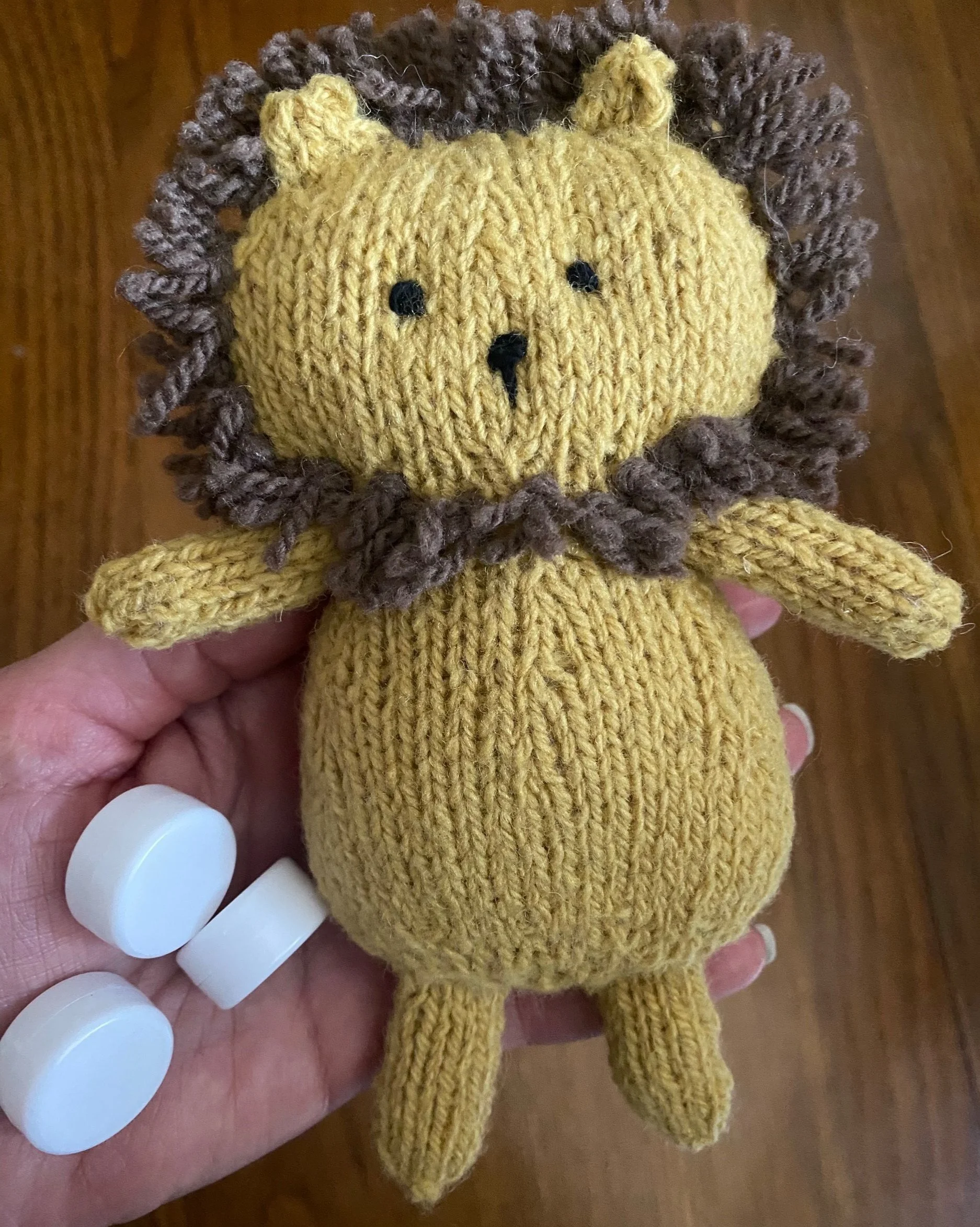 Leo was created using sport weight yarn from the kit, Poundcake for the body, arms, legs, ears and tail, and Earthen for the main, plus I added a tiny tip of it on the tail. He has the gentlest sounding rattle insert that was included in the kit. At the present time writing this the kits are not available, however the rattles are sold 4 for $2 in her mercantile shop. There is also the option to be contacted when the kits are back in stock.